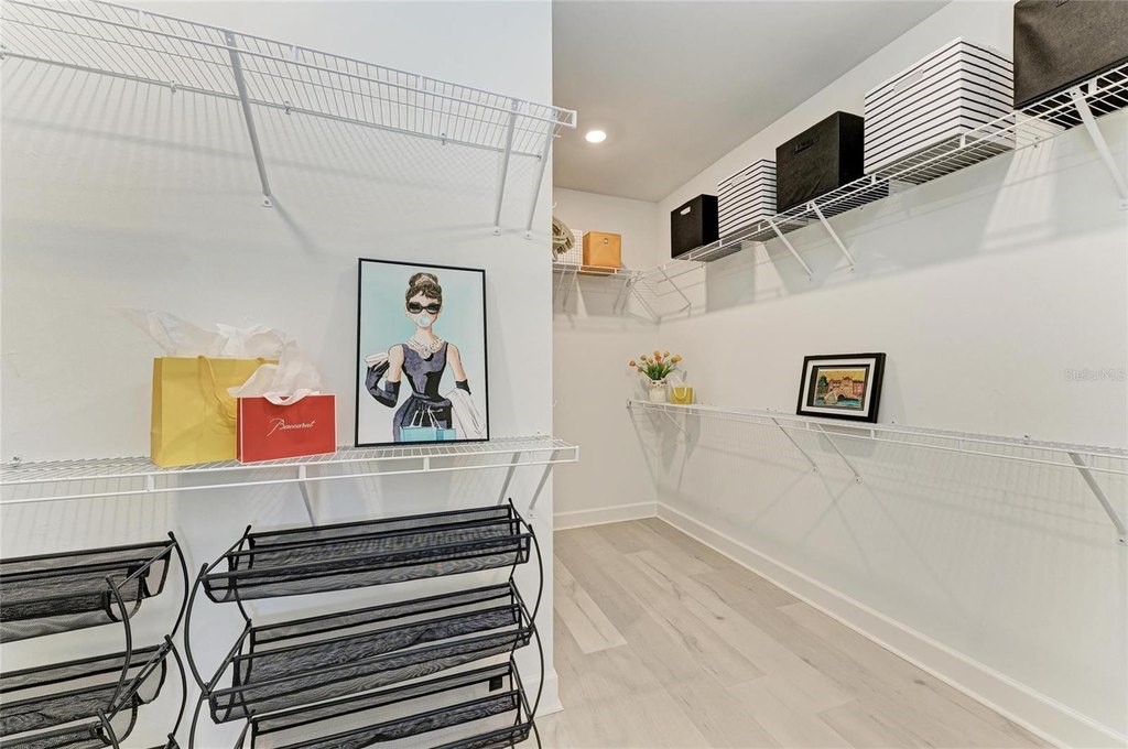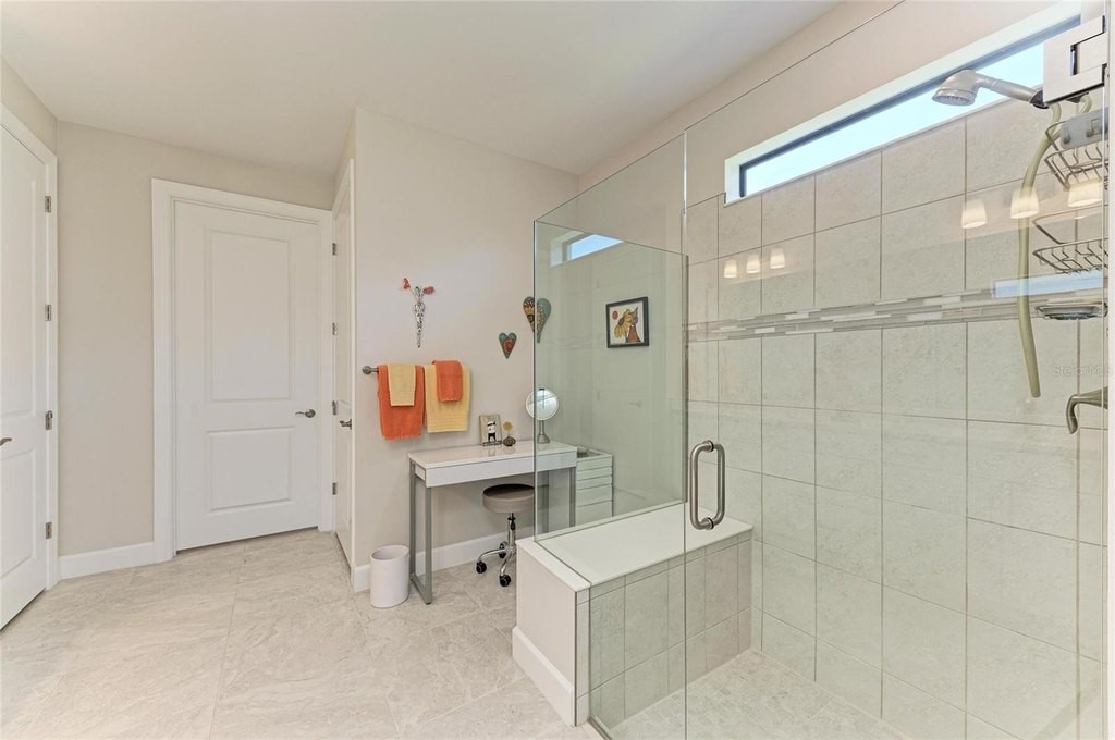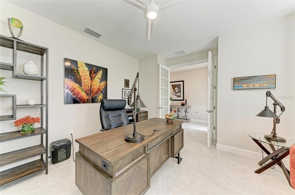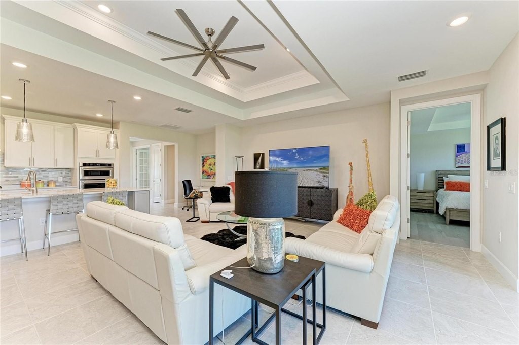Discover the epitome of modern living in the STARDOM model, nestled within the prestigious Del Webb at Lakewood Ranch, a premier active lifestyle community designed exclusively for those aged 55 and over. This exquisite home features a thoughtfully crafted split floorplan, offering two luxurious master bedroom suites that ensure privacy and comfort. With 2.5 bathrooms and a versatile den that can easily serve as a home office, this residence is perfect for both everyday living and entertaining guests. Spanning over 2,200 square feet, the open layout is accentuated by quality upgrades and an abundance of natural light, thanks to the expansive 15-foot-wide sliding glass doors that seamlessly connect the indoor space to the screened lanai. The heart of this home is undoubtedly the gourmet kitchen, designed for culinary enthusiasts and social gatherings alike. Featuring an oversized island that is just shy of 12 feet, elegant quartz countertops, and a stunning marble tile backsplash, this kitchen is as functional as it is beautiful. Equipped with top-of-the-line built-in Kitchen Aid stainless steel appliances and a spacious walk-in pantry, meal preparation becomes a delightful experience. The owner's suite serves as a private retreat, complete with plantation shutters for added seclusion, and an en-suite bathroom that boasts dual sinks, a luxurious walk-in shower, and a generous walk-in closet, ensuring ample storage for all your needs. Beyond the exquisite interior, the outdoor living space invites you to unwind and enjoy the serene surroundings. The screened lanai is perfect for sipping morning coffee or relaxing in the evening breeze, all set on a well-sized 0.21-acre lot that offers plenty of room for outdoor activities. The extended garage provides additional storage or space for hobbies and golf carts, catering to your active lifestyle. At Del Webb you will enjoy world-class amenities, including 6 tennis courts, 8 pickleball courts, bocce ball, a state-of-the-art fitness center, group classes, a resort-style pool and lap pool, an on-site restaurant and bar, and a variety of clubs and social activities-all overseen by a full-time Lifestyle Director. The community's prime location provides easy access to Sarasota, Bradenton, Tampa, St. Petersburg, Gulf Coast beaches, and two area airports. Shopping, dining, and cultural attractions are minutes away at the nearby UTC mega shopping district. Meticulously maintained and move-in ready, make you appointment today!